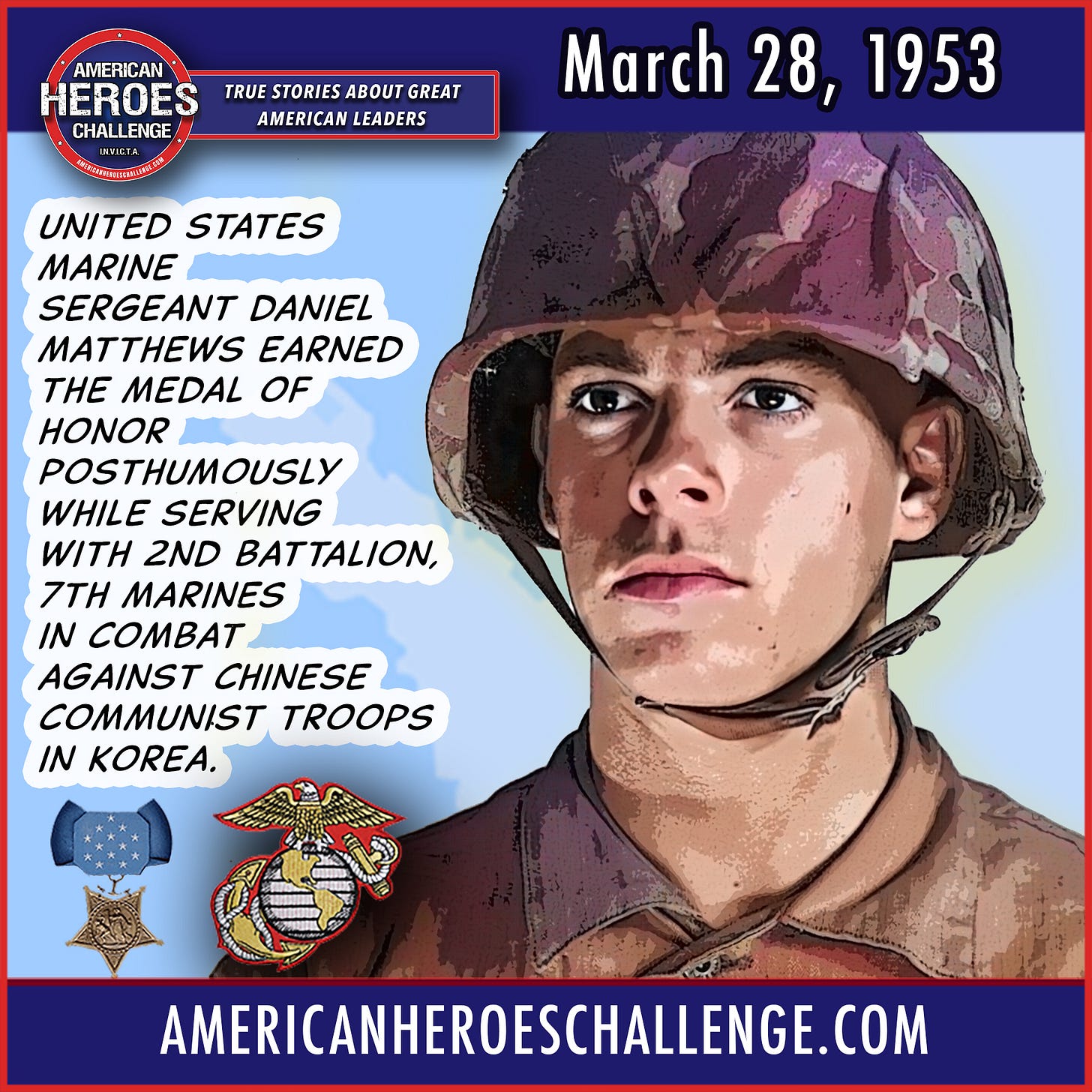 Daniel Matthews earned the Medal of Honor posthumously in Korea when he single-handedly attacked an enemy machine gun post that was preventing the evacuation of a wounded Marine. Honor and remember him!