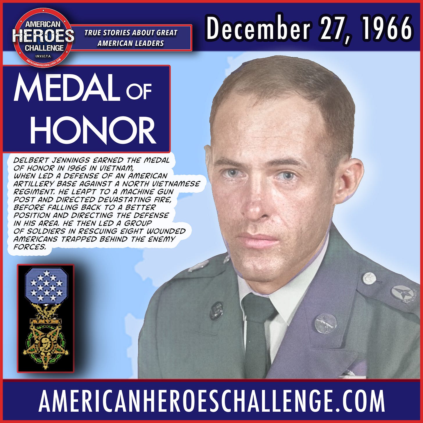 Delbert Jennings earned the Medal of Honor in 1966 in Vietnam, when led a defense on an American artillery base by a North Vietnamese regiment. He left to a machine gun post and directed devastating fire, before falling back to adefensible position and directing the defense in his area. He then led a group of soldiers in rescuing eight wounded Americans trapped behind the enemy forces. Honor and remember Delbert Jennings!