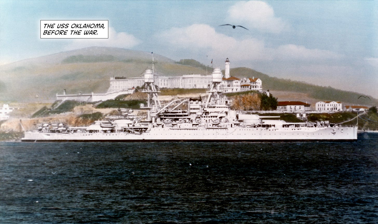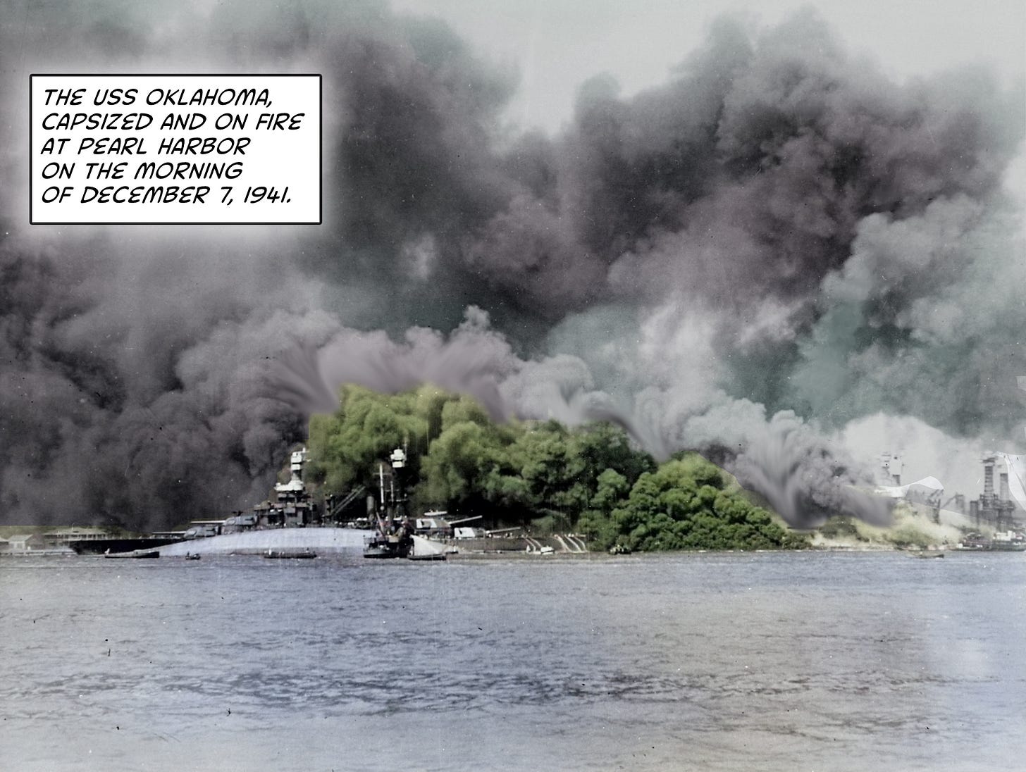 When the Oklahoma was hit by Japanese torpedoes on the morning of December 7, Flaherty stayed in one of the ship’s turret, shining a flashlight so that his fellow sailors could escape. He was trapped when the ship rolled over, twelve minutes after she was first hit.