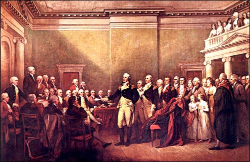 Washington officially resigned his commission in front of Congress in Philadelphia on December 23, saying “having now finished the work assigned me, I retire from the great theatre of action, and bidding an affectionate farewell to this august body, under whose orders I have so long acted, I here offer my commission, and take my leave of all the employments of public life."