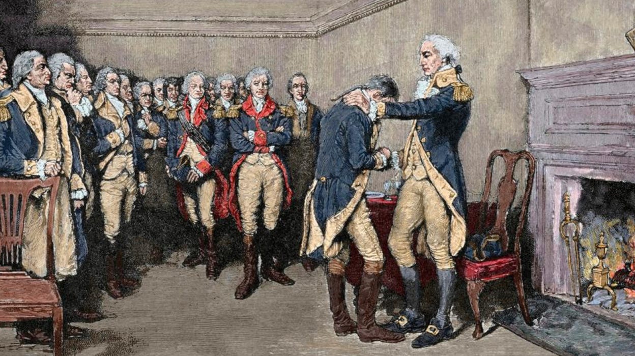 "After the officers had taken a glass of wine General Washington said, ‘I cannot come to each of you but shall feel obliged if each of you will come and take me by the hand.’ General Knox, the closest officer to Washington, walked up to the General and the two hugged and kissed with tears running down their faces."