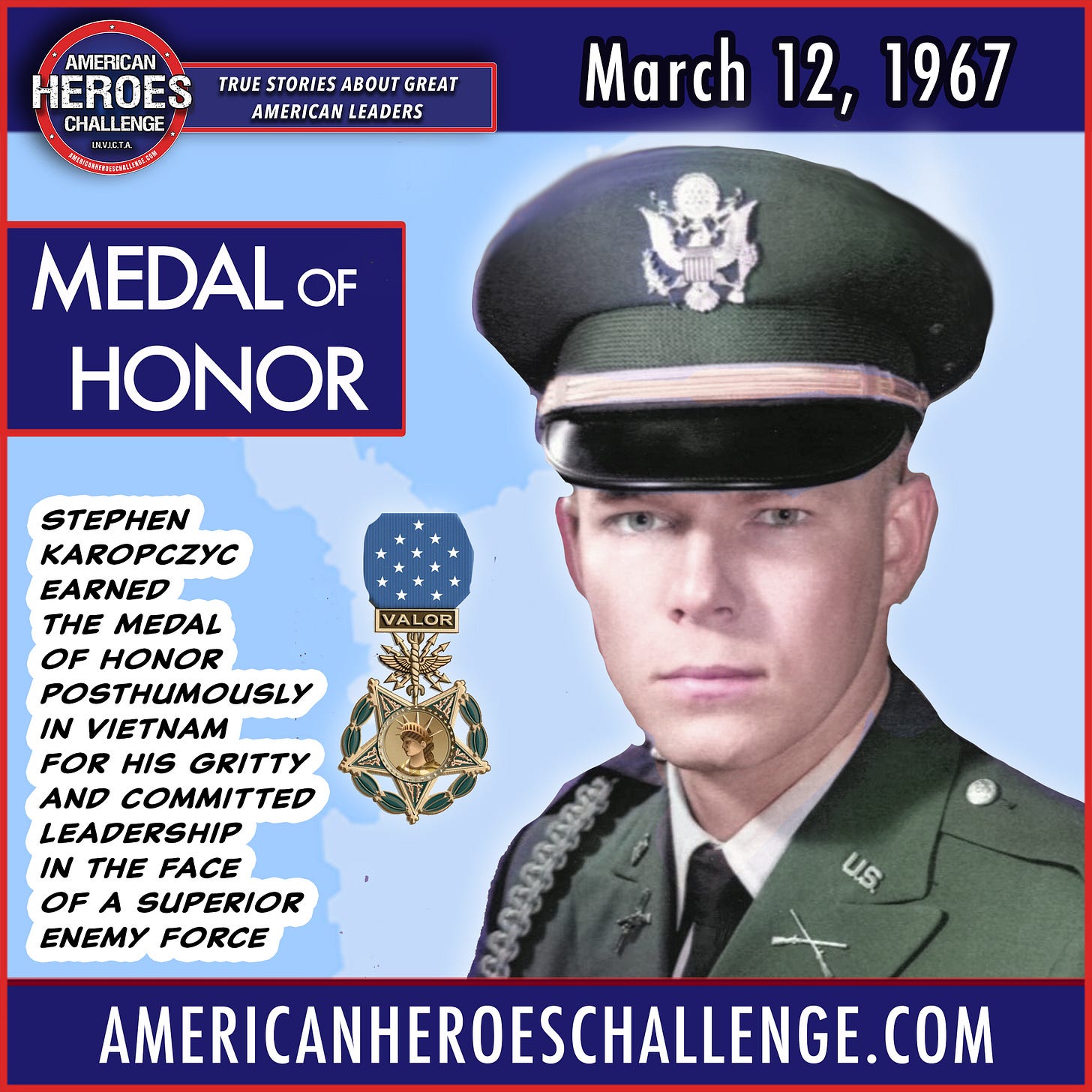 Stephen Karopczyc earned the Medal of Honor posthumously in Vietnam for his gritty and committed leadership in the face of a superior enemy force, where Karopczyc stayed in the fight and directed his platoon thought seriously wounded. At the battle’s apex, he smothered an enemy grande with his helmet to save the lives of his fellow soldiers. Honor and remember him!