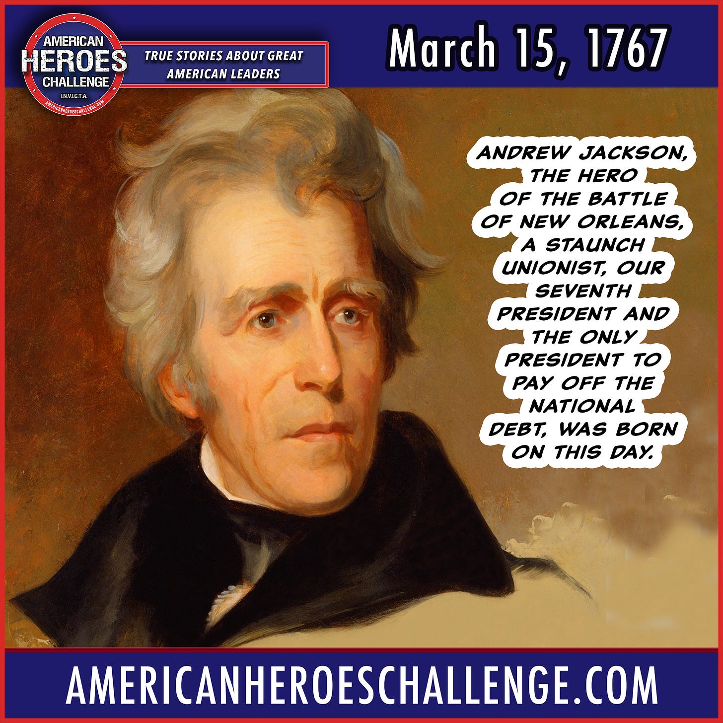 March 15 Andrew Jackson BornThe Only President To Pay Off The National DebtJF MurphyMar 14, 2025ShareAndrew Jackson, the hero of the battle of New Orleans, a staunch unionist, our seventh president and the only president to pay off the national debt, was born on this day.PreviousNext