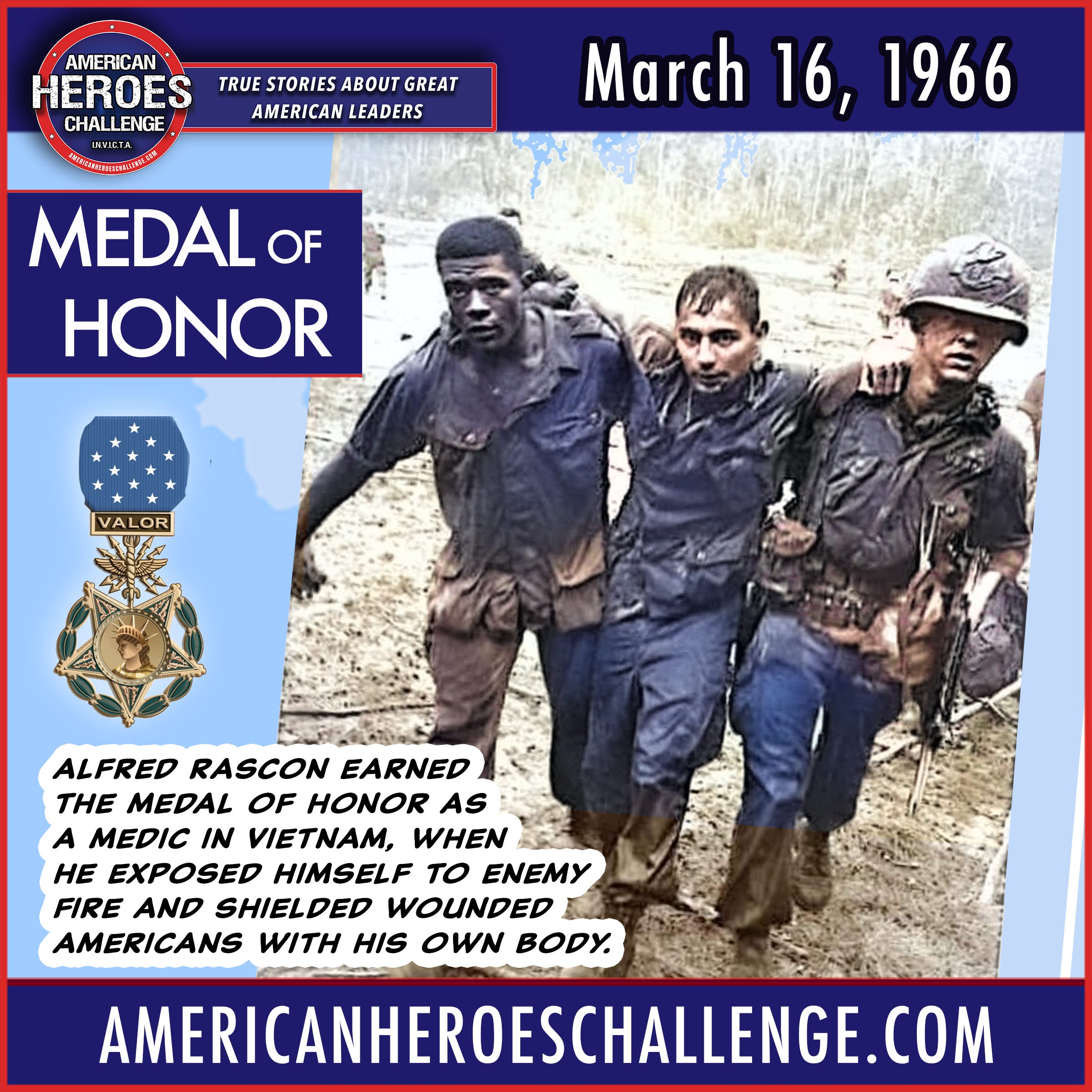 March 16, 1966 Alfred RasonMedal of Honor in VietnamJF MurphyMar 16, 2025ShareAlfred Rascon earned the Medal of Honor as a medic in Vietnam, when he exposed himself to enemy fire and shielded wounded Americans with his own body. Honor and remember his service!PreviousNext