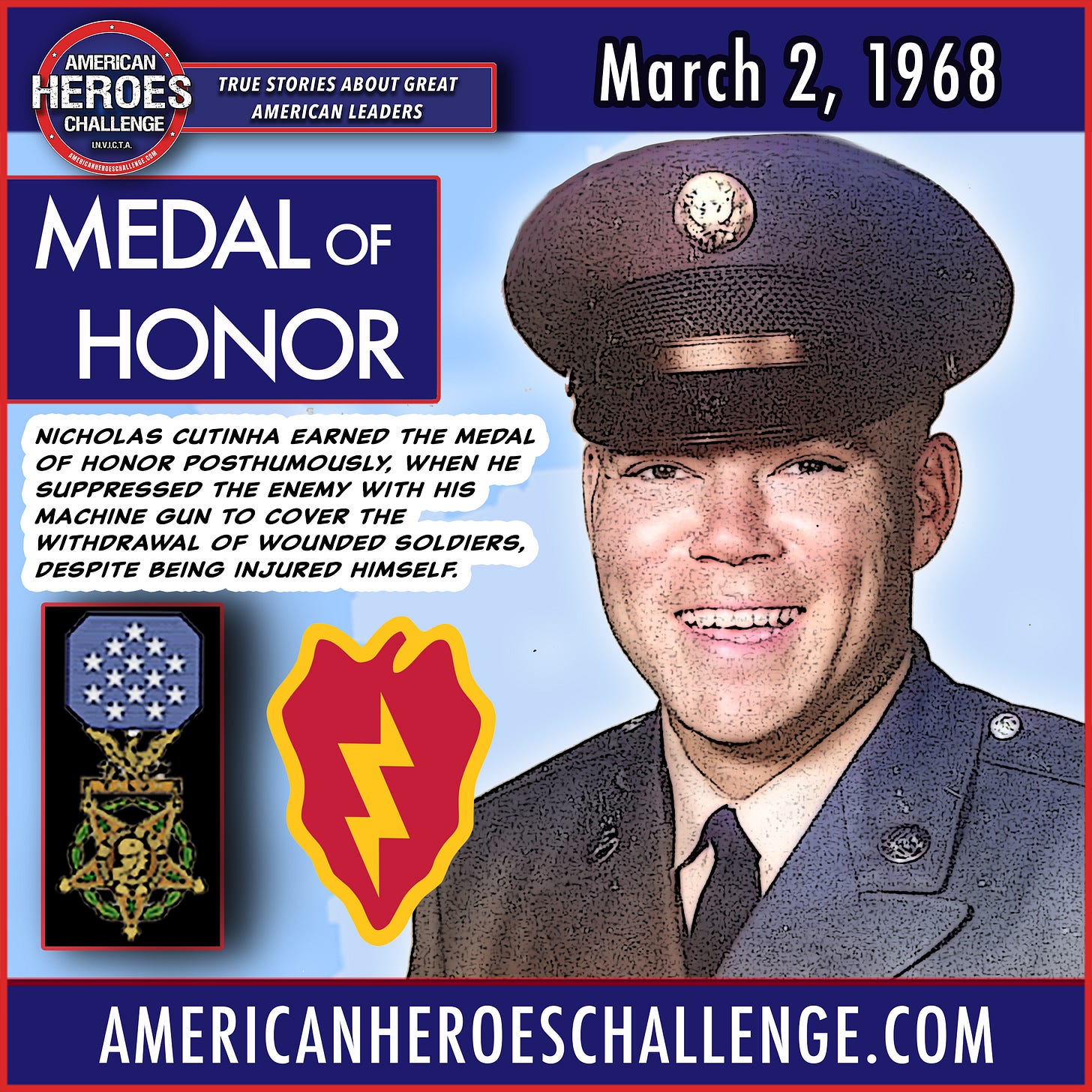 With half of his company killed or wounded, and despite being shot in the leg himself, Cutinha kept firing his M-60 relentlessly. His courage and firepower gave his fellow soldiers the precious time they needed to evacuate the wounded and retreat to safety.
